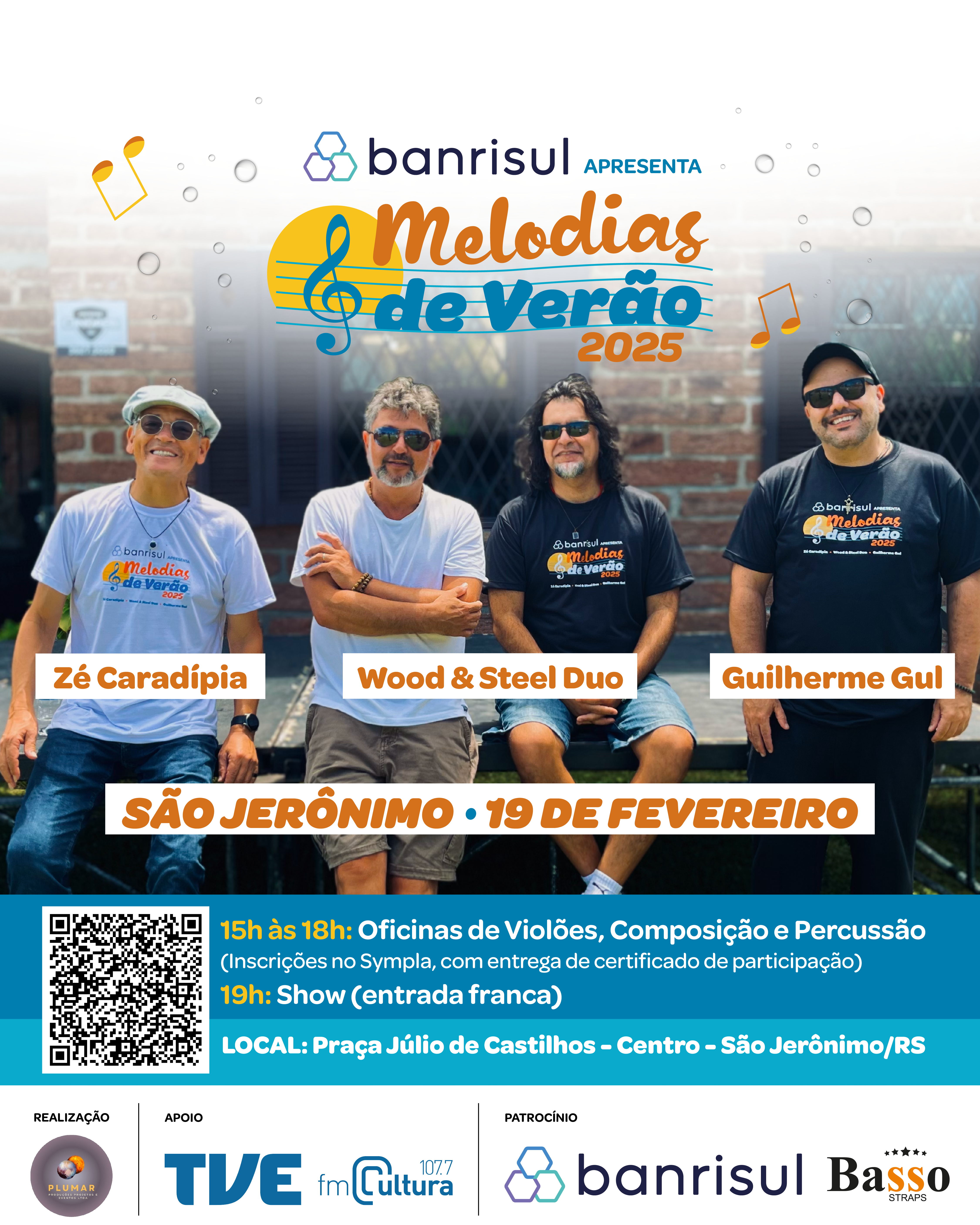São Jerônimo recebe o Melodias de Verão 2025! Prepare-se para um dia especial repleto de música, arte e cultura! No dia 19 de fevereiro, a nossa Praça Governador Júlio de Castilhos será palco de um evento inesquecível, como parte do Programa Banrisul de Patrocínios 2025.