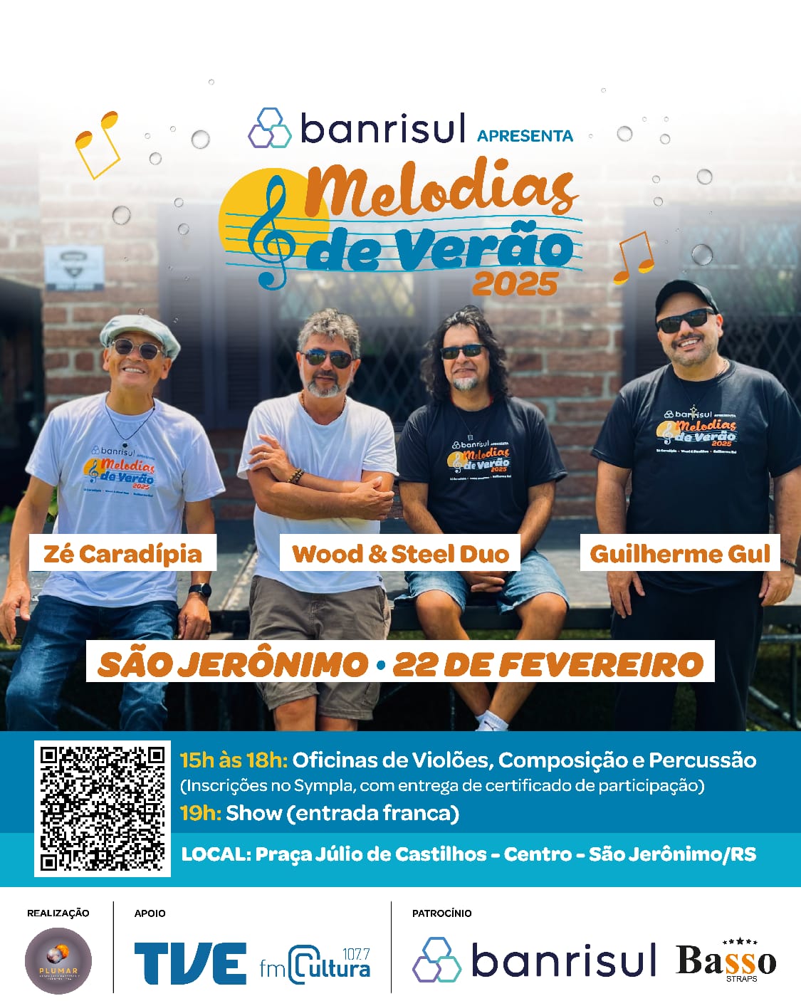 São Jerônimo recebe o Melodias de Verão 2025! Prepare-se para um dia especial repleto de música, arte e cultura! No dia 19 de fevereiro, a nossa Praça Governador Júlio de Castilhos será palco de um evento inesquecível, como parte do Programa Banrisul de Patrocínios 2025.